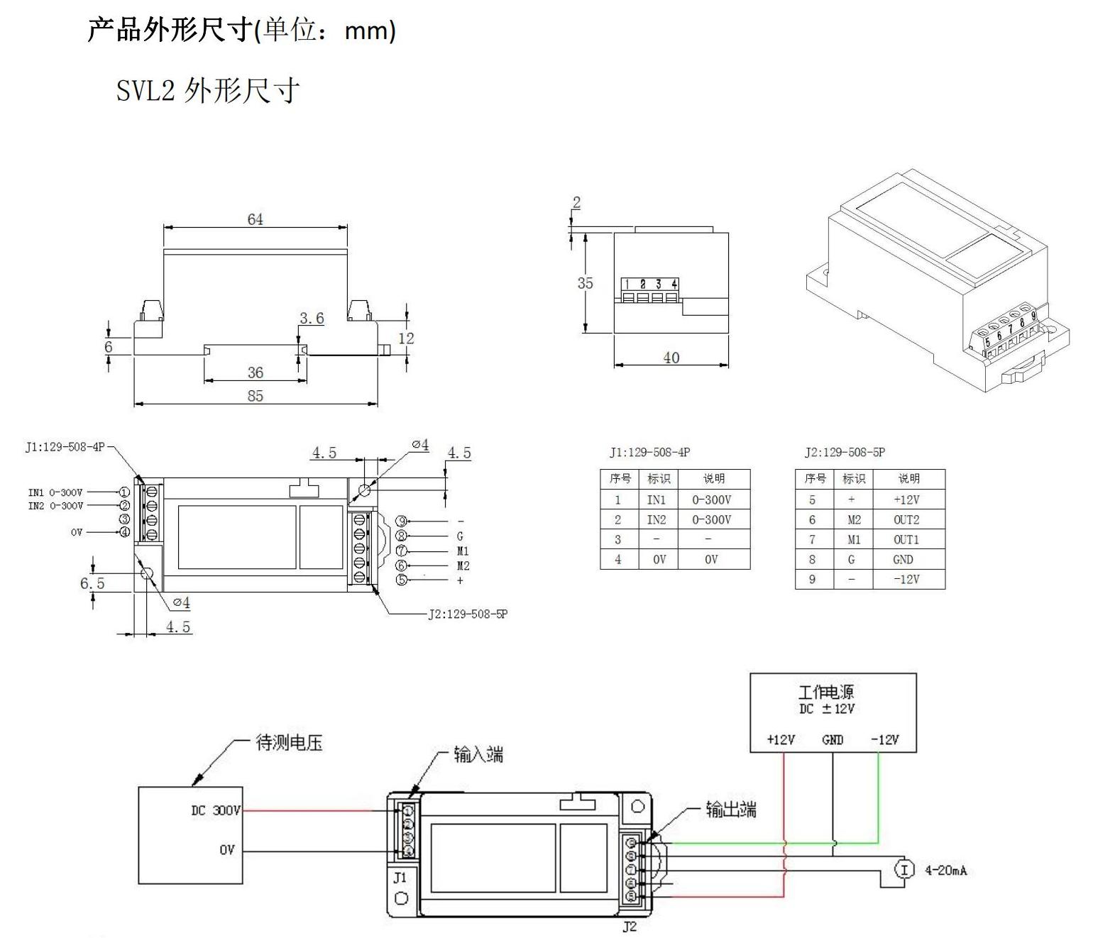 直流電壓隔離轉換,將直流高壓信號轉化為4-20mA標準信號輸出,便于測量;可以直接與各型A/D轉換器配接,也可以直接與數字面板表或其它儀表相接;導軌式安裝,簡潔方便,被測電壓如大于500V, 則輸入/輸出為單路。